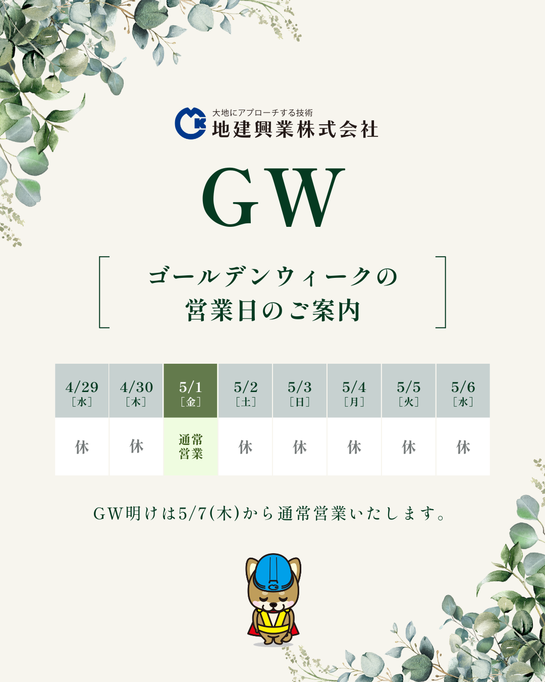 地建興業株式会社では誠に勝手ながら、ゴールデンウィーク休業日を下記のとおりとさせていただきます。